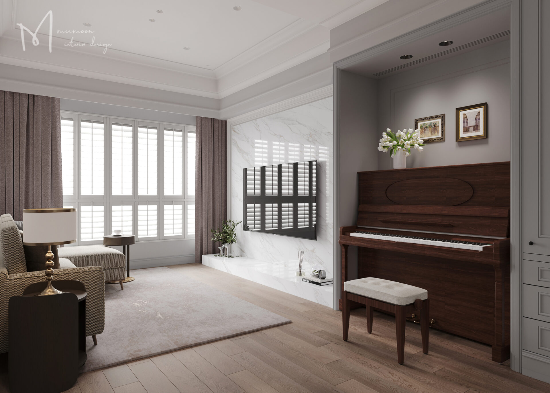 整體空間透過門片及壁面造型飾板的修飾,讓玄關成為回家前轉換環境的重要角落。左前方規劃造型飾板作為儲物間收納區,入門右側規劃收納鞋櫃區域,鞋櫃區規劃平台作為鑰匙及收納信件的位置。